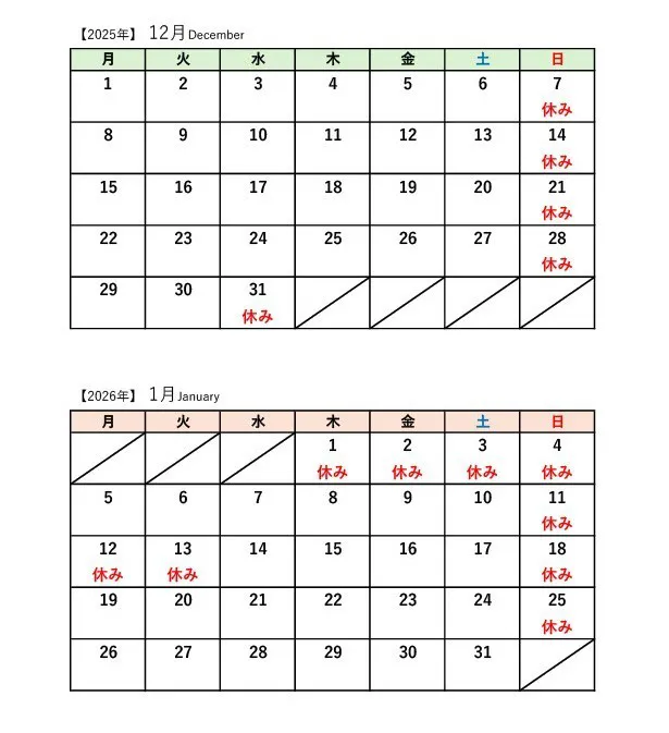 1日(木)~4日(日)・11日(日)~13日(火)・18日(日)・25日(日)